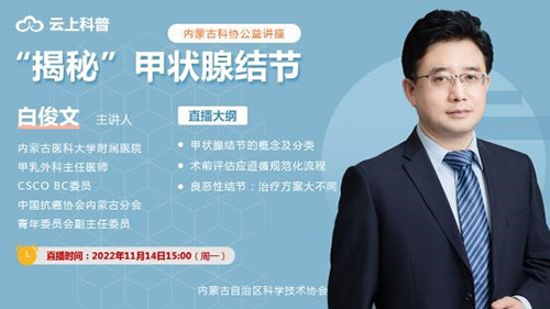 2022年11月14日,内蒙古科协邀请内蒙古医科大学附属医院甲乳外科主任医师白俊文,开展题为《揭秘甲状腺结节》的科普直播讲座。本次讲座是云上科普平台“专家科普讲座”系列活动之一,累计在线观看人数近5000人。