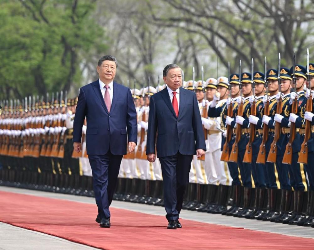 4月15日上午,中共中央总书记、国家主席习近平在北京人民大会堂同来华进行国事访问的越共中央总书记、国家主席苏林举行会谈。这是会谈前,习近平在人民大会堂东门外广场为苏林举行欢迎仪式。新华社记者 李响 摄