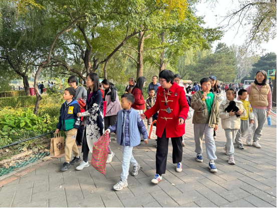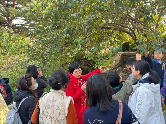 随后,在国家植物园(北园)植物研究所教授级高级工程师陈燕带领下进入实地探索环节。孩子们与家长边走、边看、边学,开启了一场秋日植物“打卡之旅”。沿着秋日植物观测路线,孩子们近距离观察树叶的形状脉络、果实颜色,并积极提问、捡拾落叶、花朵、松果、种子等“秋日素材”,让课堂上学到的理论知识在自然实景中得到生动印证,在观察与互动中,深化了对秋日植物的认知,真切感受到自然探索的乐趣。
