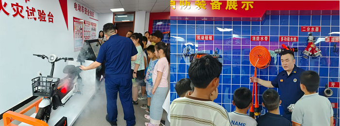 在互动环节,为了让学生们更深刻直观的了解电动车起火的过程和原因,消防队员为学生们准备了电动车火灾试验台,让学生们近距离接触消防装备和防护用品等项目,身临其境感受火灾的凶险和消防队员工作的不易。学生们认真询问消防装备的使用方法,消防队员耐心讲解,营造了浓厚的学习氛围,形成了“大人学技能、孩子记知识”的良好氛围。