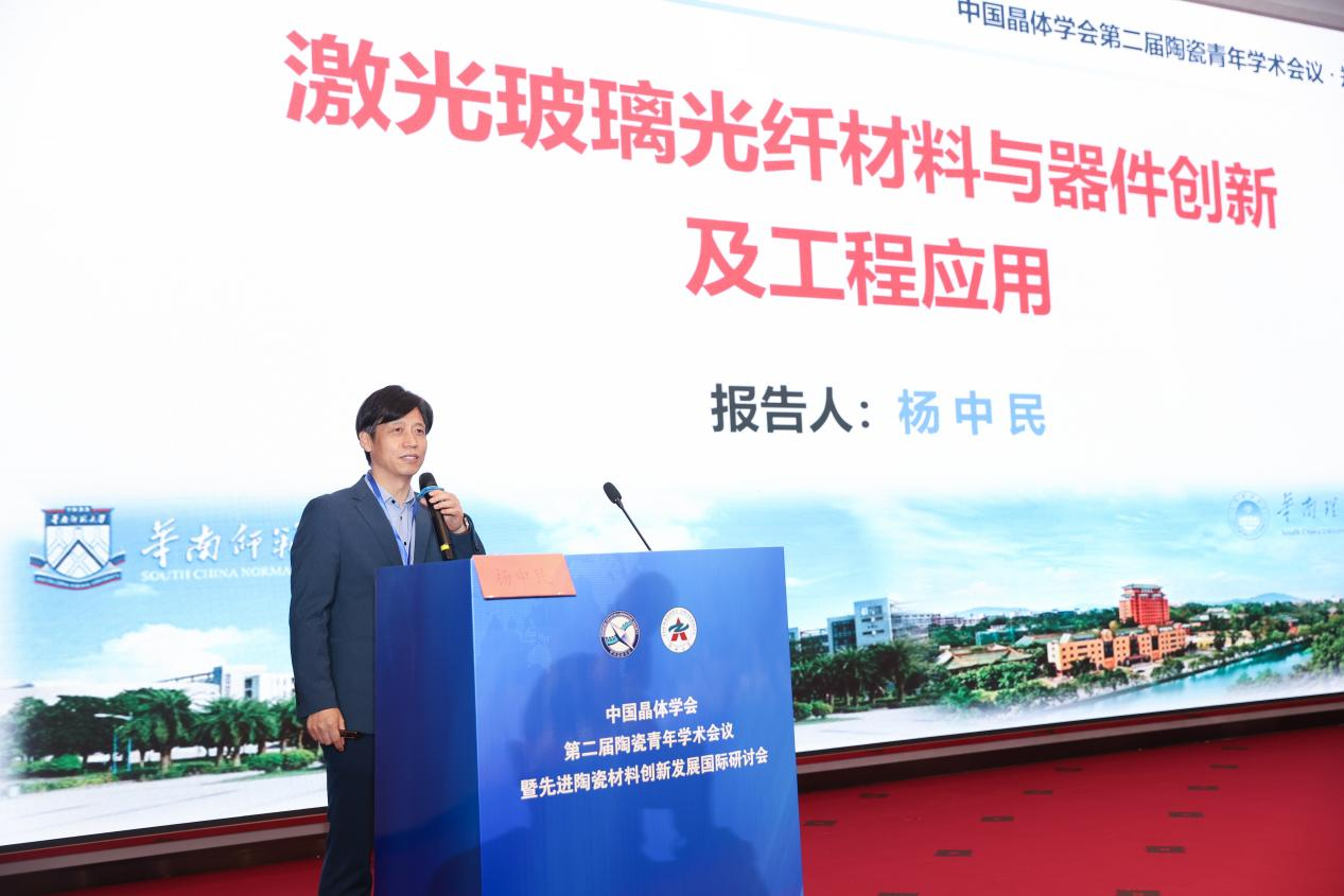 华南师范大学校长杨中民教授作了题为《激光玻璃光纤材料与器件创新及工程应用》的专题报告,详细介绍了稀土掺杂玻璃组分的定量设计理论及其在玻璃光纤制备中的新技术突破。他还展示了拉制出具有最高增益宽带的玻璃光纤,以及被众多著名学者誉为“最高功率、最高重频”的高性能光纤激光器,该产品已在高精尖激光装备和大科学装置等领域得到广泛应用。